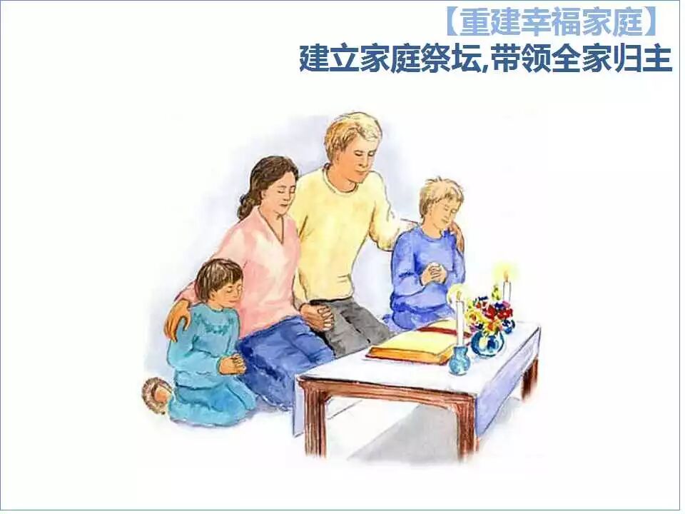 上帝的话要医治、建造我们的教会以及家庭,主要可归纳出三个原则:先知(价值观)、祭司(和上帝、和人的关系)、君王(角色、能力)。建造家庭的原则,和建立教会、建立小组的属灵原则一模一样。我们在教会学习到的一般牧养原则,都适用在家庭里。我们在教会里怎么样带小组、怎么带祷告会,都可以应用在家庭里。例如,要准备家庭祭坛,最简单的方法是把小组聚会材料的破冰拿回家用,家庭祭坛时如果可以使用破冰材料,家庭祭坛的效果会很好,因为小朋友很喜欢玩游戏。
