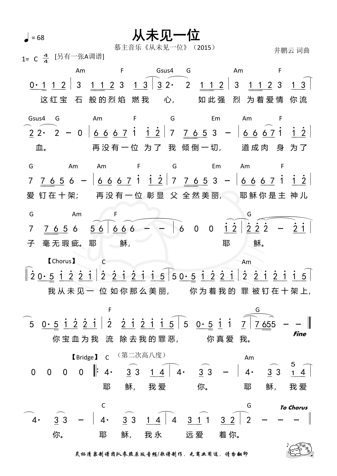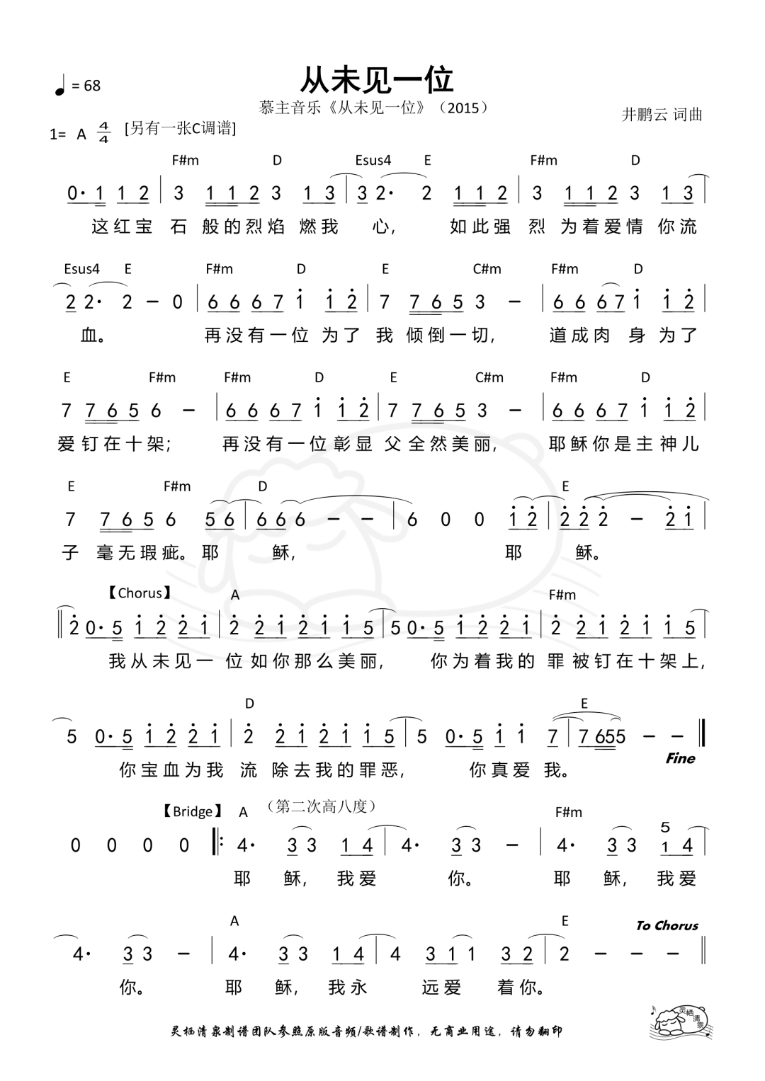 从未见一位 (Never Seen Another Like You) Written by Alvan Jiing, 耶稣我唯一的热情 written by Alan Hsueh, Melody Hwang Translated by Artem Shatov, CCLI# 7043898 ©2015 Alvan Jiing Music Publishing (ASCAP) 这红宝石 般的烈焰 燃我心 Deep in my heart the fire of God is burning 如此强烈 为著爱情 你流血 Sardis like can’t be contained, it’s growing 再没有一位 为了我 倾倒一切 Nothing can compare to Your love given to all 道成肉身 为了爱 钉在十架 Took on human flesh, Son of man, God’s only Son 再没有一位 彰显父 全然美丽 Spotless Lamb of God, Lord of lords, King of all kings 耶稣你是主 神儿子 毫无瑕疵 Nothing can compare to Your love nailed to the cross 耶稣 耶稣 Jesus Jesus 我从未见一位如你那麽美丽 Never have I seen one as awesome as You 你为著我的罪被钉在十架上 Bearing all my sins, You gave life at the cross 你宝血为我流除去我的罪恶 Shedding blood You washed over my aching soul, 你真爱我 You love me so 耶稣 我爱你 Jesus, I love You 耶稣 我爱你 Jesus, I love You 耶稣 我永远爱著你 Jesus, I love You to the end 耶稣我唯一的热情 Jesus you’re my one Desire 我要永远爱你 I will always love you 永远来跟随你 I will always follow