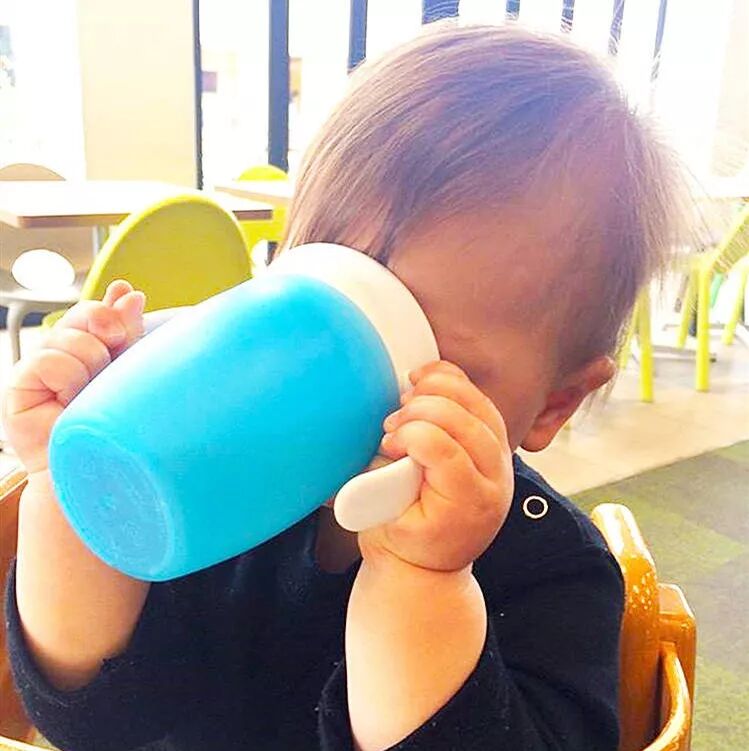 宝宝自己抓着杯身的把手,咕噜咕噜仰着头就把水送进小肚肚。