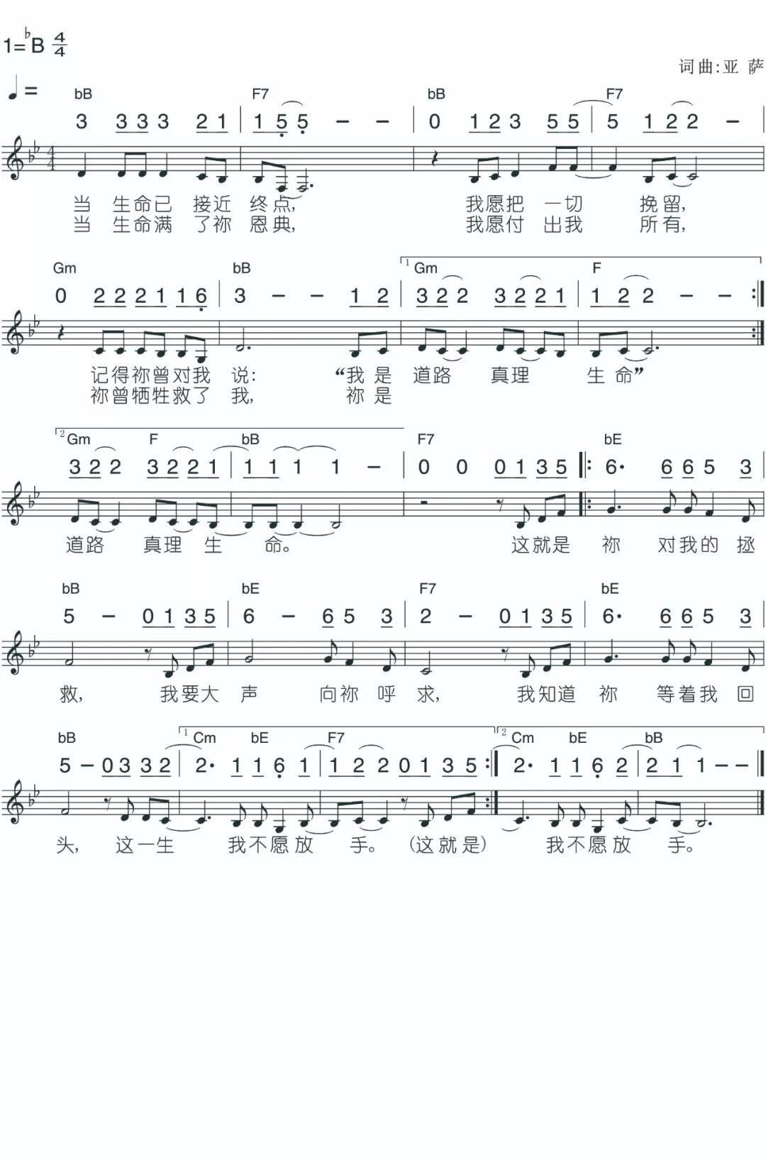 +- 首页 赞美诗歌 正文 音频播放地址: 视频播放地址: 词曲:徐池 (亚萨) 当生命已接近终点 我愿把一切挽留 记得你曾对我说 我是道路 真理 生命 当生命满了你恩典 我愿付出我所有 你曾牺牲救了我 你是道路 真理 生命 这就是你对我的拯救 我要大声向你呼求 我知道你等着我回头 这一生我不愿放手 歌谱: 赞美诗歌未整理以斯拉盛晓玫祝瑞莲生命河灵粮堂小羊诗歌Jesus Image天韵合唱团新酒使命团我心旋律JLSS BlessedThe Hope佳音 收藏 分享 链接