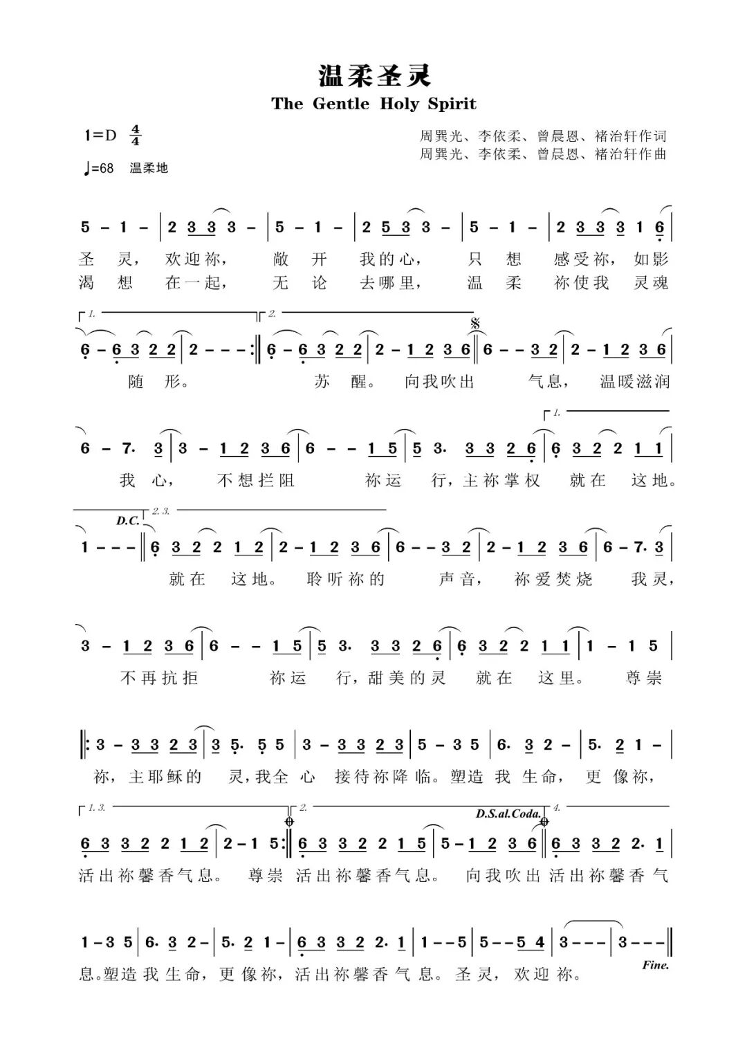 温柔圣灵 / The Gentle Holy Spirit 词曲Written / 周巽光 Ewen Chow、李依柔 Zoey Lee、曾晨恩 Yosifu Tseng、褚治轩 A.C 编曲 / Music Arrangement :褚治轩 A.C 演唱者/周巽光 Ewen Chow English lyrics translated by Peace Teo 张和平 Verse1 圣灵欢迎你 敞开我的心 Welcome Holy Spirit to open my heart 只想感受你 如影随形 Desire to feel You and follow You Verse 2 渴想在一起 无论去哪裡 Long to be together no matter where I go 温柔你使我 灵魂苏醒 Your gentleness awakens my soul Chorus 向我吹出气息 温暖滋润我心 Breathe into me to warm and enrich my heart 不想拦阻你运行 主你掌权就在这地 Never stop Your atmosphere God You reign this land 聆听你的声音 你爱焚烧我灵 Listen to Your voice Your love set fire to my soul 不再抗拒你运行 甜美的灵就在这裡 Never deny Your atmosphere Here’s Your sweetest spirit Bridge 尊崇你主耶稣的灵 我全心接待你降临 Honouring Jesus Your spirit I embrace Your presence with my heart 塑造我生命更像你 活出你馨香气息 Build my life with Your likeness We live by Your breath