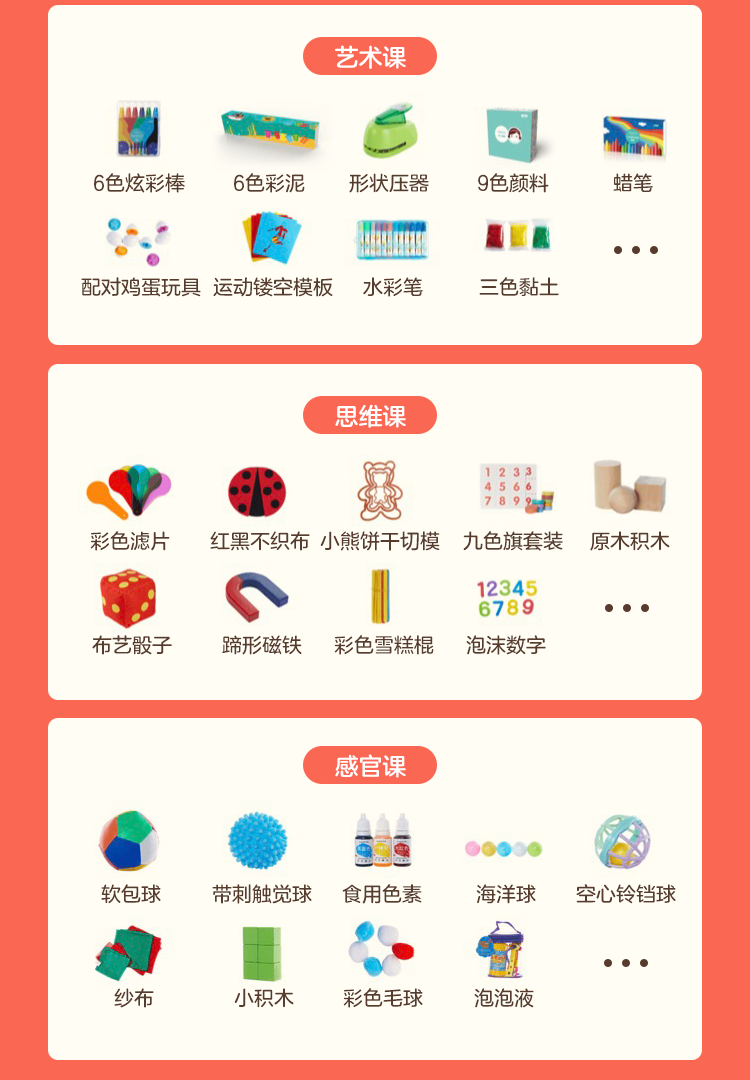 每当宝宝到达某一月龄,我们就会寄送该月龄课程需要用到的教具。年卡寄送的教具,