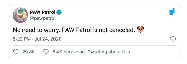 在白宫发布会上发表声明几个小时后,汪汪队片方的官方账号发布了一则消息:“不用担心。汪汪队没有被取消。”