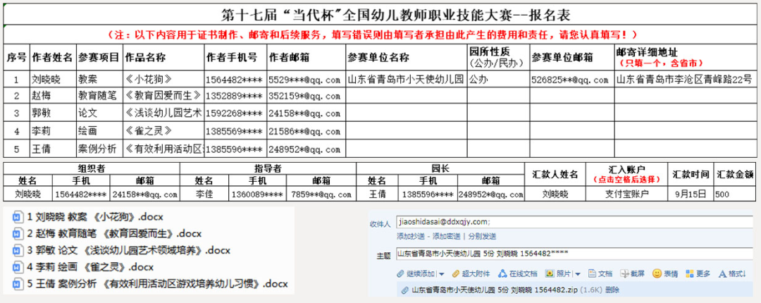 3. 作品报送方式:汇款后将“全部参赛作品+报名表(附件11)+汇款凭证照片”一起打包压缩,附在同一邮件中发送至大赛专用投递邮箱[email protected] .其中,参赛作品命名规则为:“序号+姓名+参赛项目+作品名称”;邮件标题命名规则为:“幼儿园名称+作品数量+组织者姓名+组织者电话”,(报送格式参照以下截图)