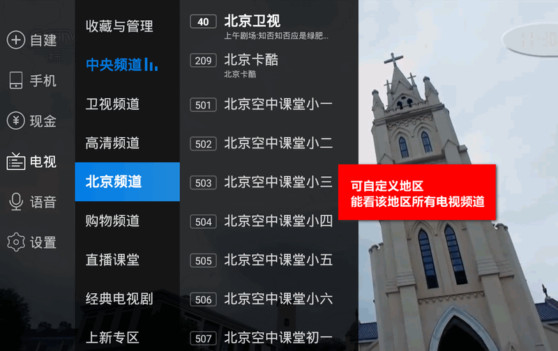 2.这个全能直播工具支持自定义地区频道,比如在设置里选定喜欢看的地方频道,那么就会在直播频道里多出个地方频道,比如北京频道,里面罗列了北京地区所有电视频道。