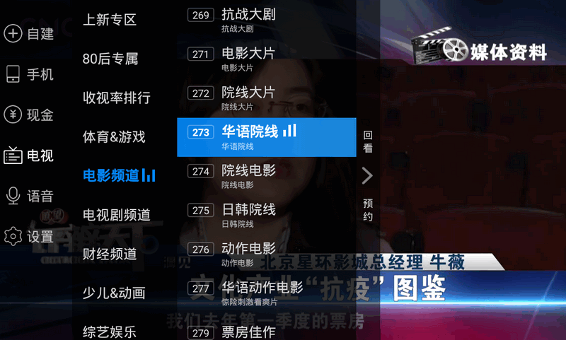 4.除了电视直播频道,还有一些电视剧频道、电影频道,里面有各种专题、类型电视剧和电影,比如院线大片、抗战大片、华语院线、动作电影、票房最佳、华语动作电影等等。