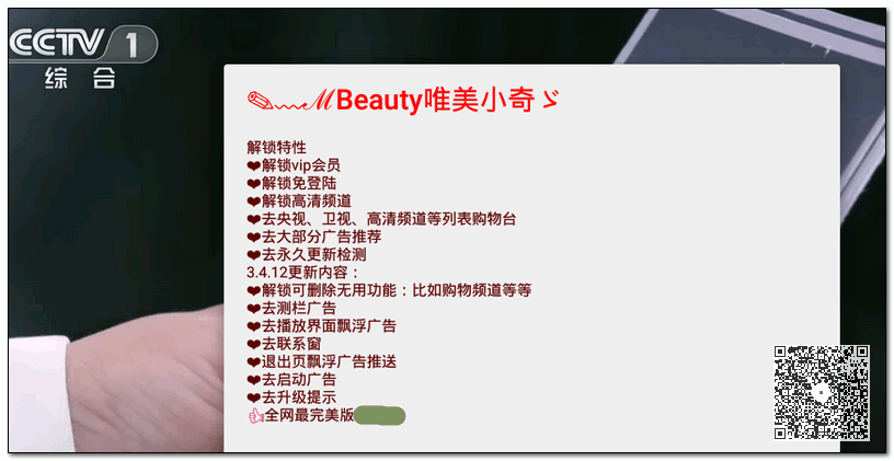 1.首次安装,会弹出如下图所示解锁说明,关闭之后就不会再弹出了。根据软件修改大神唯美小奇的说法,已经解锁了VIP、高清频道,同时去除了各类广告,还去除了永久更新检测、升级提示等等。