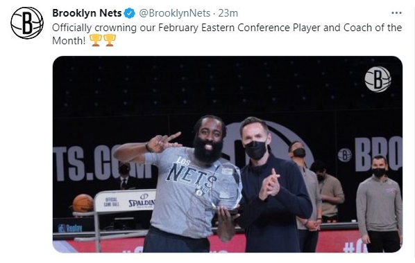 纽约德比赛前,纳什与哈登分别领取2月份东部月最佳教练与东部月最佳球员奖项。