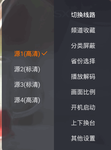 在设置选项只可进行切换播线路、省份选择、播放解码切换;