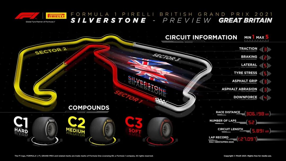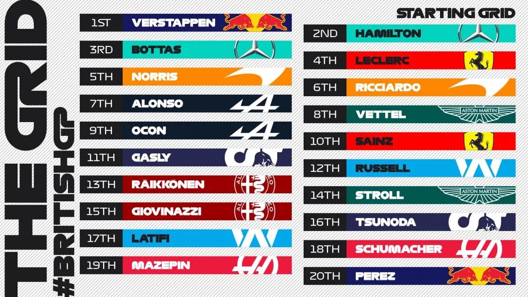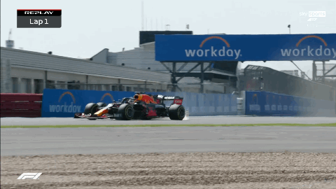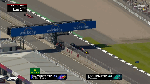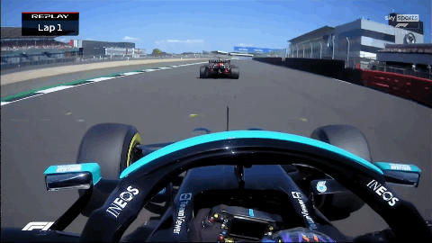 后方,由于Verstappen和Hamilton之间的缠斗,致使前6起步的车手都挤在了一起,第三竞争尤为激烈,Leclerc和两辆McLaren在弯道来回试探,尝试超车Bottas。Luffield弯(7号)出弯略微走大,Hamilton和Verstappen并驾齐驱,Hamilton占据行车线,Vertappen岂能请饶,向内线施压。却不想后轮已经夹到Hamilton的两轮之间。加速时Hamilton的左前和Verstappen的右后发生高速撞击,反作用力致使Verstappen飞射出赛道,怼进了轮胎墙。赛后之后罚时Hamilton10秒。