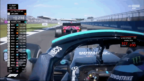 第52圈,今日的Corpse弯是Hamilton的幸运弯,1小时之前,Hamilton在这里弹飞了Verstappen,叫停了比赛,一小时后,同一个弯道,他又把Leclerc挤走了。