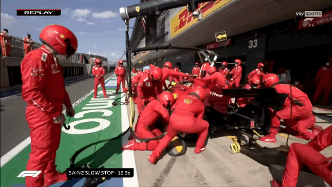 第29圈,Sainz第二名进站。然后,换胎出了幺蛾子……12.3秒。出站 未能卡在Hamilton之前,Ferrari二打一的战术泡汤了。