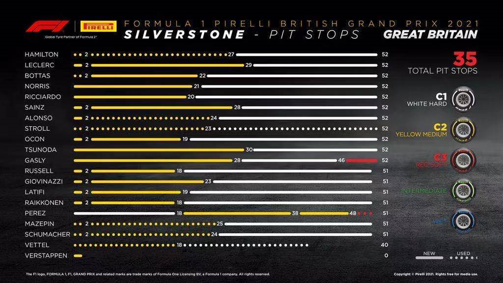 第19圈,Hamilton已经在Leclerc身后1秒的位置。官方给到的轮胎数据不容乐观。后方,Vettel成为第一个黄胎进站换胎的车手,其他车手也陆续跟进换胎。