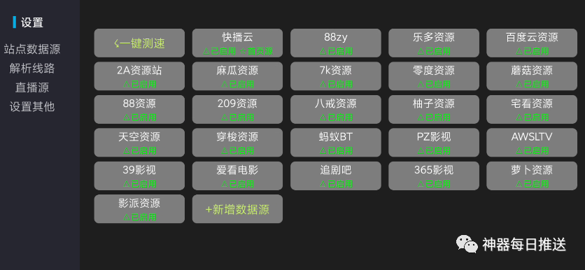 3.单击相关菜单可打开资源或者关闭资源,支持添加xml格式影视源。