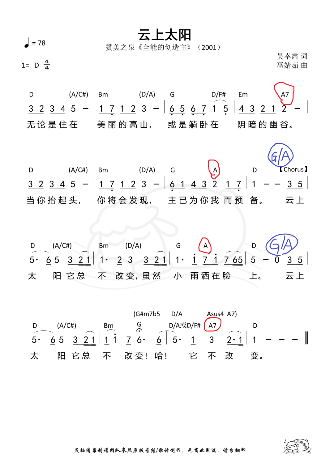 用《云上太阳》举例:红色圆圈的A或A7和弦都可以替换成G/A是上述第1)种,蓝色手写添加G/A是上述第2)种