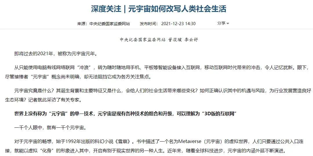 2021年12月23日,国家纪委监委正式针对元宇宙发表了一篇长文,