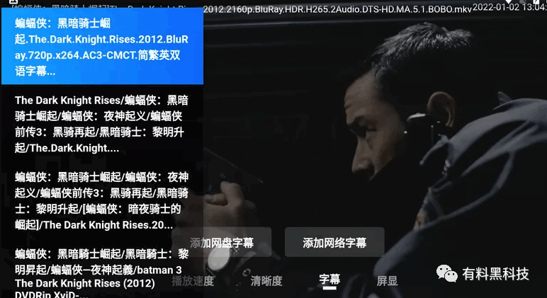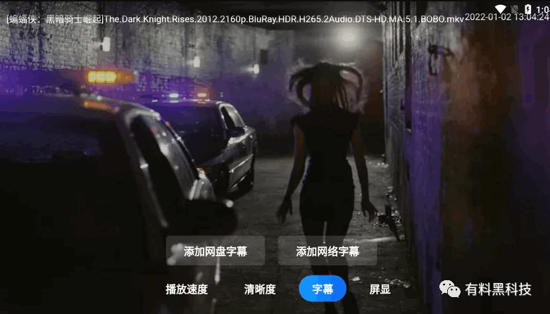 这里特别说明一下「阿里云盘107TV版」的字幕外挂功能,我们打开一部电影,可以调出字幕添加设置功能,支持添加网盘字幕和添加网络字幕。