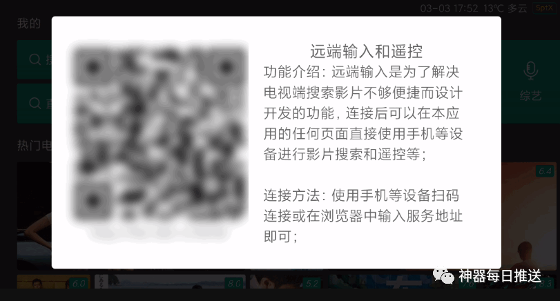 4、支持局域网远程输入,简单说,首先要确保手机、电视采用同一局域网网络,然后扫描远端操作菜单里面的二维码,然后就可以直接在手机端输入或者复制黏贴内容进行搜索影视剧了,手机操作完,还需要用电视遥控装置切换或者确定即可执行操作。