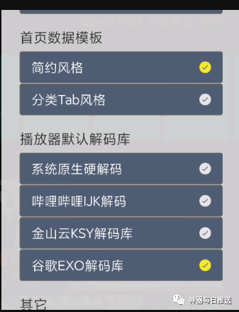 2、提供持系统原生硬解码、哗哩哗哩JK解码、金山云KSY解码库、谷歌exo解码,区别不是很大,采用默认的解码库即可。