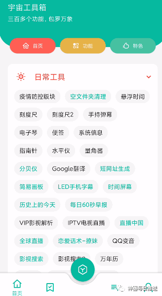 1、「宇宙工具箱141终身会员版」集成的黑科技功能主要包括以下几个类型:日常常用工具、系统工具、图片工具、查询工具、提取工具、开发工具、文字工具、计算工具、其它工具、趣味游戏等等。