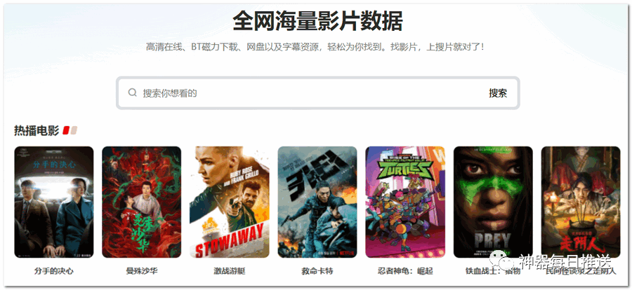 这是一个全网影视聚合网站,聚合全网影片数据,提供高清在线、BT磁力下载、网盘以及字幕资源,每天搜集最新电影、电视剧、在线观看网址,相比于去搜索引擎找资源,这种影视聚合网站更直接干脆。