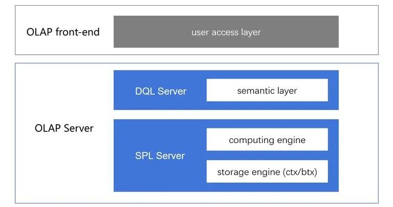 只有高性能还不够,SPL 原生的计算语法不适合多维分析应用接入(生成 SPL 语句对 BI 系统改造较大)。目前大部分多维分析前端都是基于 SQL 开发的,但 SQL 体系(不用宽表时)在描述复杂关联计算上又很困难,基于这样的原因,SPL 设计了专门的类 SQL 查询语法 DQL(Dimensional Query Language)用于构建语义层。前端生成 DQL 语句,DQL Server 将其转换成 SPL 语句,再基于 SPL 计算引擎和存储引擎完成查询返回给前端,实现全链路 BI 查询。需要注意的是,SPL 只作为计算引擎存在,前端界面仍要由用户自行实现(或选用相应产品)。