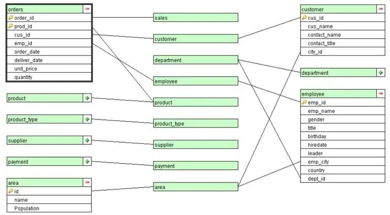 基于这种结构下的关联查询(DQL 语句)会很好表达。比如要根据订单表(orders)、客户表(customer)、销售员表(employee)以及城市表(city)查询:
