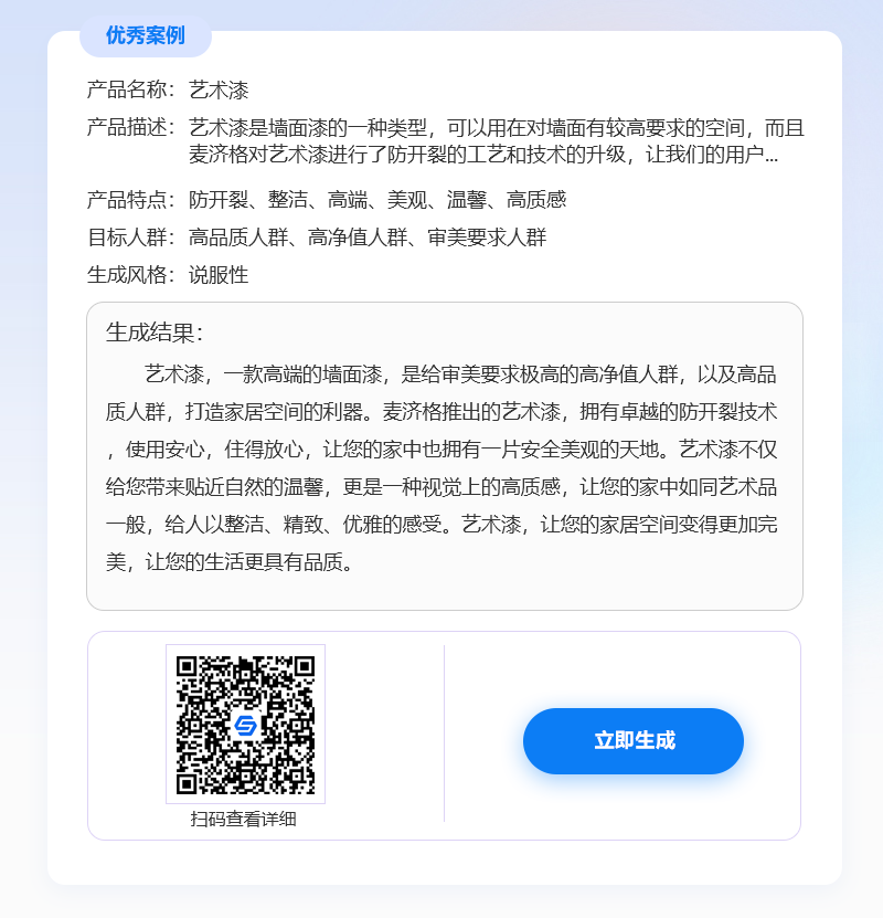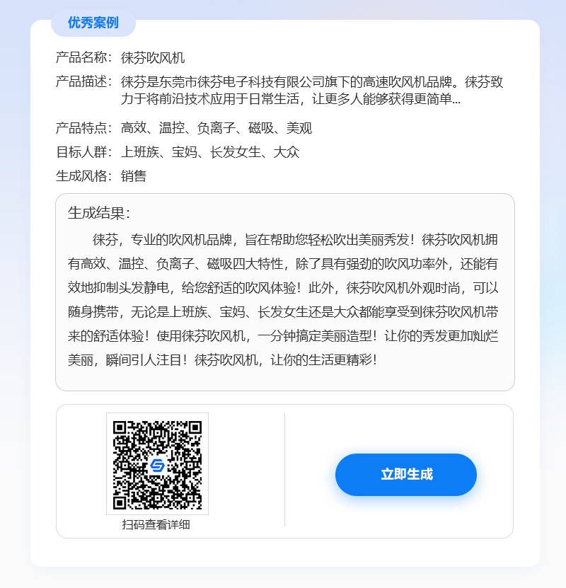 在产品信息中新增「生成风格」这一条件,使生成后的文案风格更加多样,可根据不同的营销环境,生成多个不同风格的营销文案,塑造多样化的品牌形象