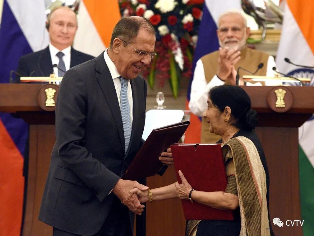 俄罗斯总统普京与印度总理莫迪举行第19次领导人年度峰会。 图为俄罗斯外长拉夫罗夫(Sergey Lavrov)与印度外长斯瓦拉吉(Sushma Swaraj)签署协议。