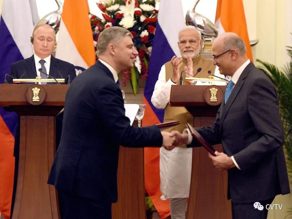 这项协议是普京与印度总理莫迪(Narendra Modi)举行第19次领导人年度峰会后签署的。两国同时签署其他8项合作协议和谅解备忘录,双方同意在能源、航天、铁路、经贸等领域加强合作。图为印度外交秘书ijay Gokhale与俄罗斯铁路公司首席执行官Oleg Belozerov交换谅解备忘录文件。
