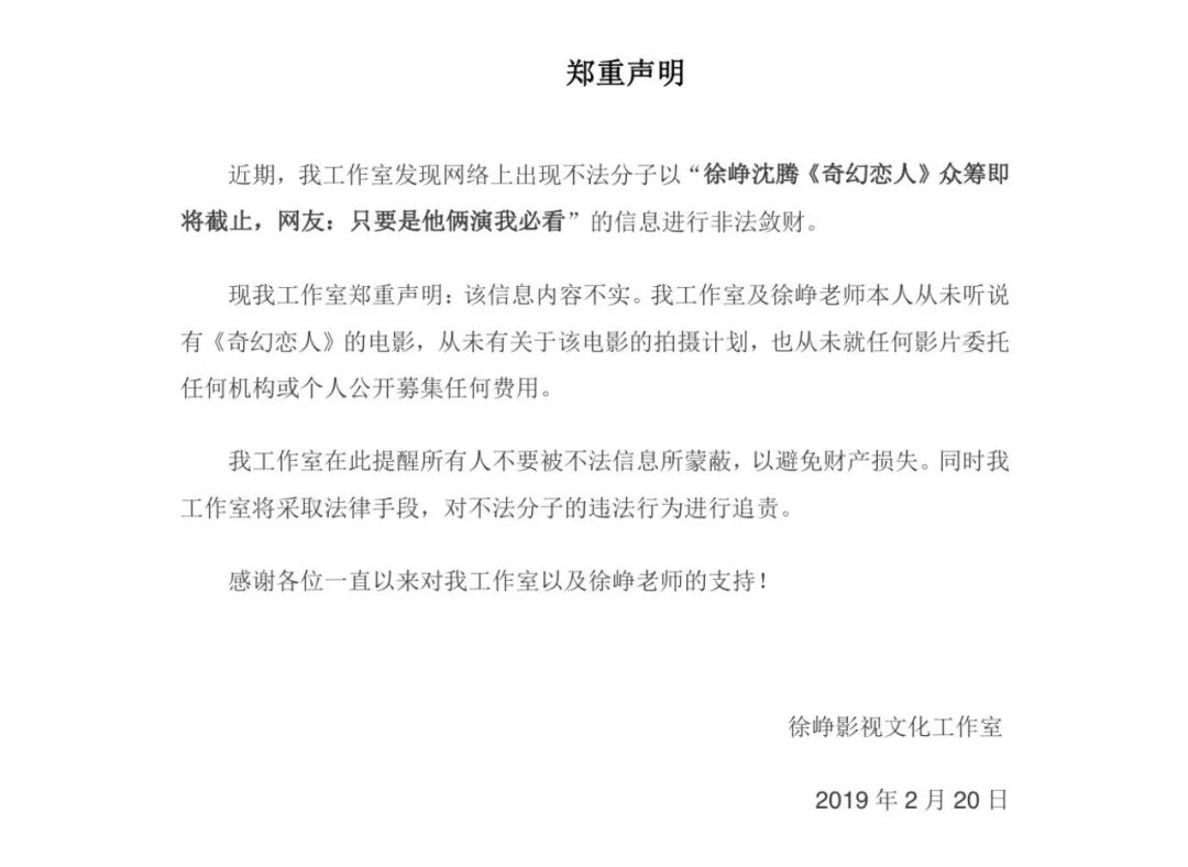 今日,徐峥影视文化工作室与沈腾工作室均发布声明,称网上出现不法分子以“徐峥沈腾《奇幻恋人》众筹即将截止……”的信息进行非法敛财。此信息内容不实。工作室及徐峥本人从未听说有《奇幻恋人》的电影。